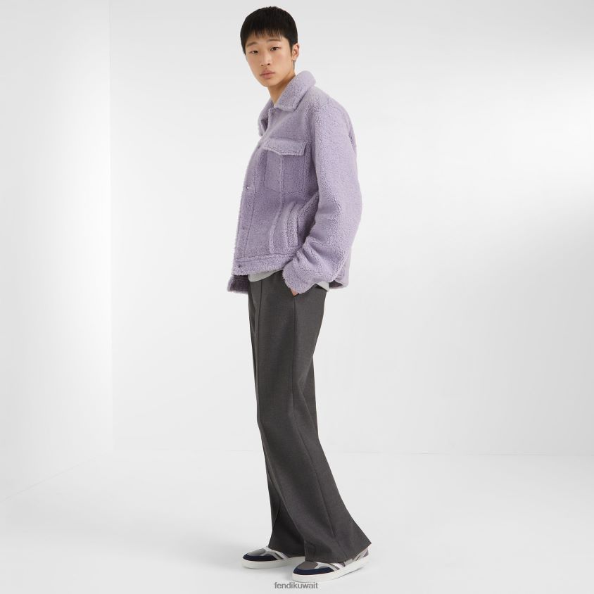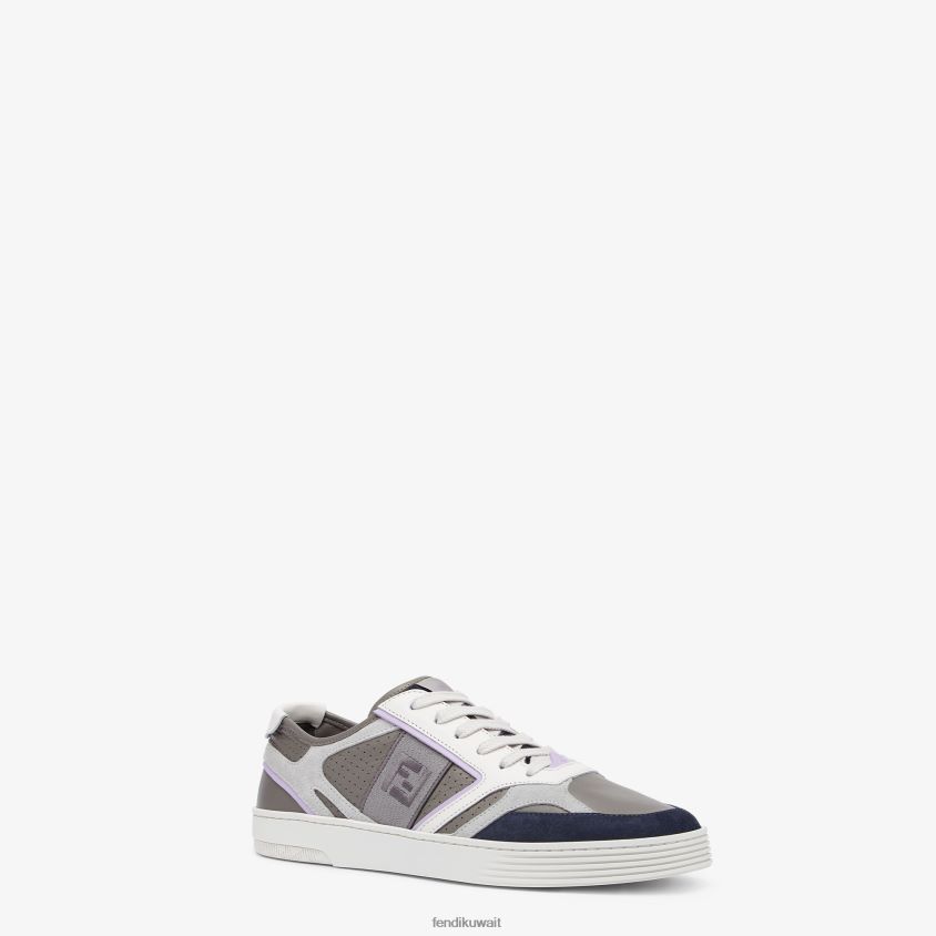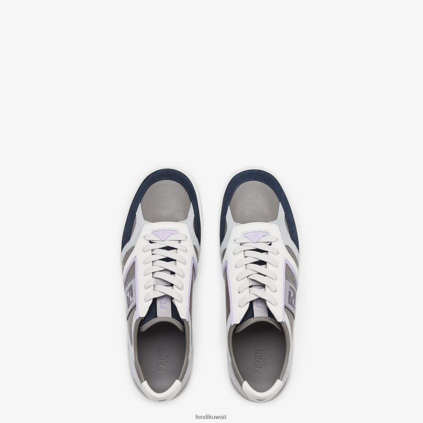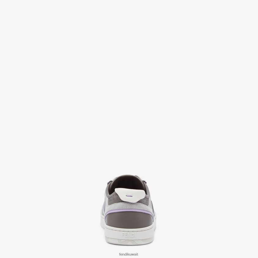 أحذية رياضية برباط. مصنوع من الجلد الرمادي. تفاصيل من جلد الغزال باللون الأزرق والأرجواني. مزين بثقوب دقيقة على الجوانب وشريط بتطريز ff. نعل مطاطي مع حروف فندي روما في الخلف.