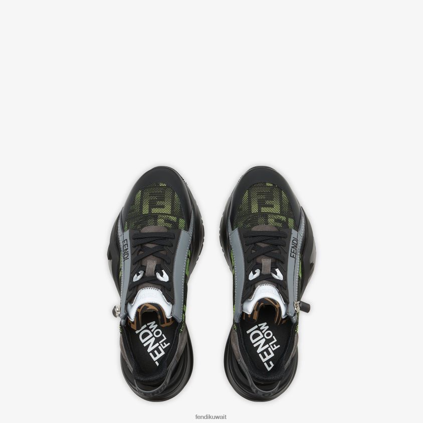 حذاء رياضي سهل الارتداء بأربطة مرنة وسحاب جانبي ونعل مموج مع نقش F. حروف فندي المتدفقة منقوشة على الكعب. مصنوع من قماش أسود مع شكل فلاش أصفر نيون. مزين بتفاصيل ليكرا مع شعار ff. نعل مطاطي أسود خفيف الوزن مع تفاصيل قطرية متطابقة.