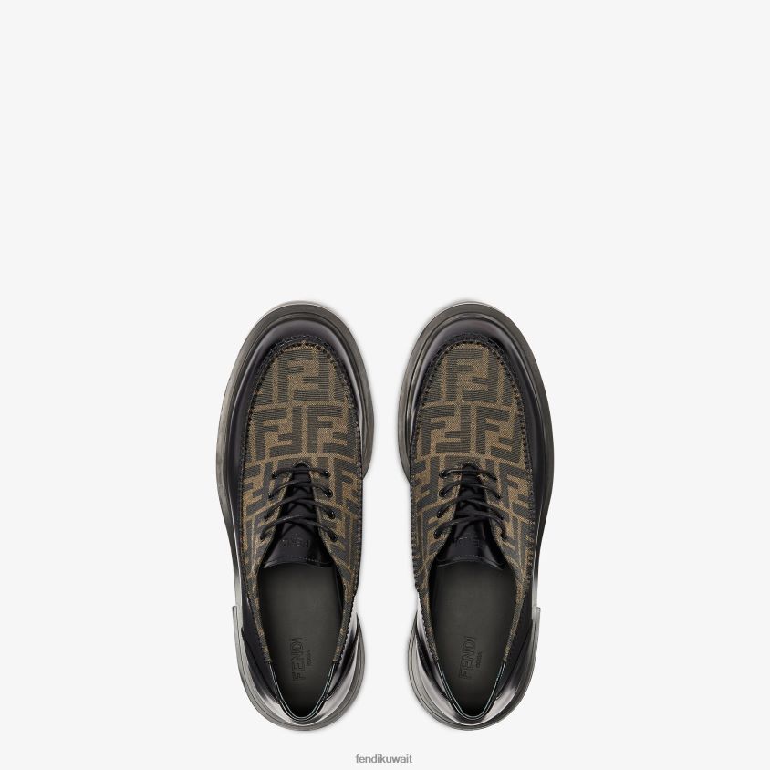 أربطة مع ساحة مخيطة يدويًا وربط بأربطة. مصنوع من الجلد الأسود. تفاصيل من قماش الجاكار باللونين التبغي والأسود. نعل مطاطي محفور على الجانب حرف f.