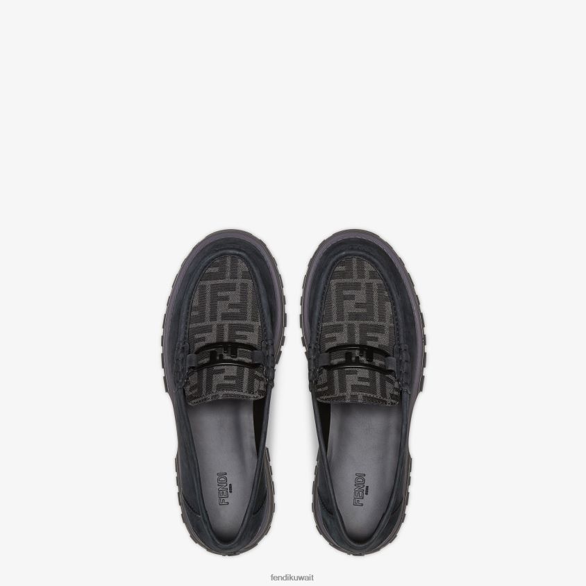 حذاء لوفر مع ساحة حذاء مخيطة بشكل مرئي وجزء علوي مزين بتفاصيل فندي أولوك. مصنوع من النوبوك الأسود. مريلة حذاء من قماش الجاكار باللونين الأسود والرمادي. نغمة على الملحقات المعدنية المطلية بالمينا. نعل مطاطي منقوش.