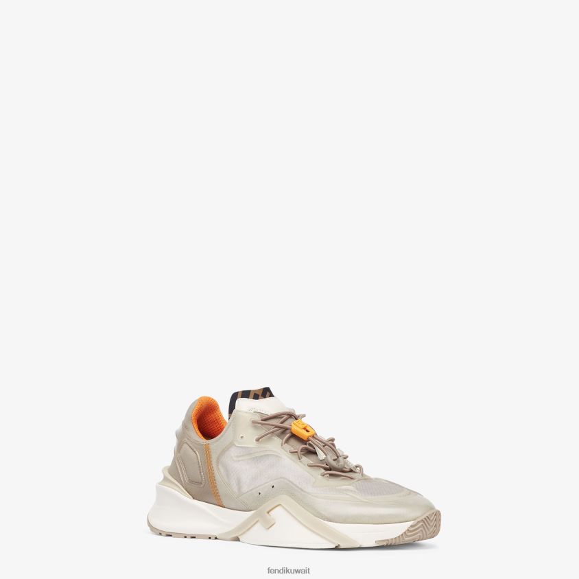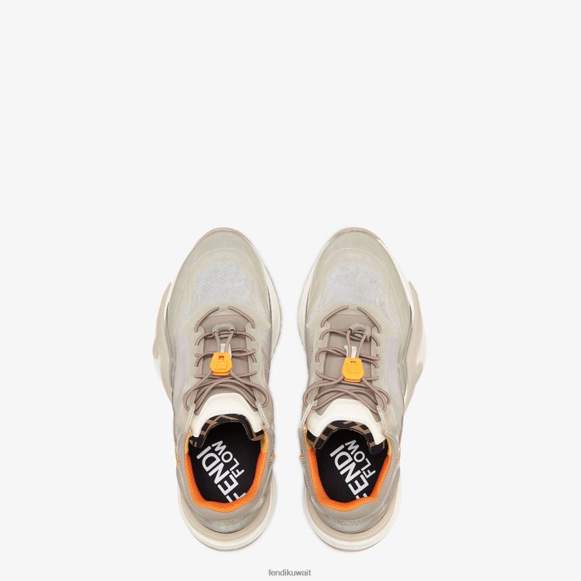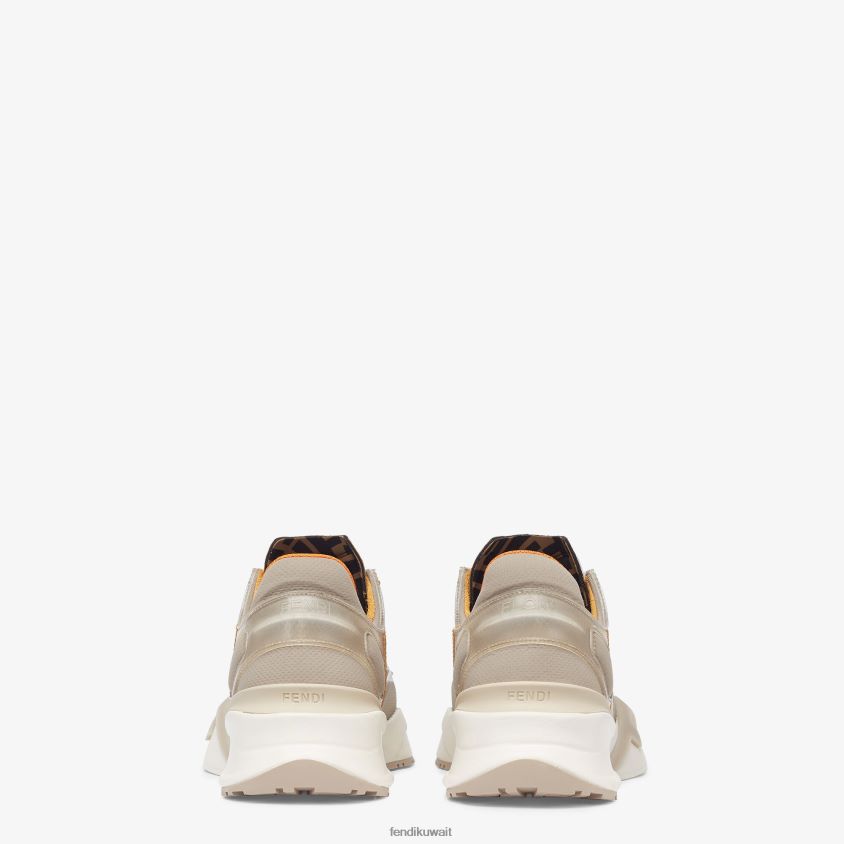 حذاء رياضي سهل الارتداء مع أربطة مرنة قابلة للتعديل وسدادة ff ونعل مموج مع نقش f. حروف فندي المتدفقة منقوشة على الكعب. مصنوع من النايلون البيج الفاتح مع طلاء محقون. تفاصيل ليكرا مع شعار ff. نعل مطاطي أبيض خفيف الوزن مع تفاصيل قطرية باللون البيج.