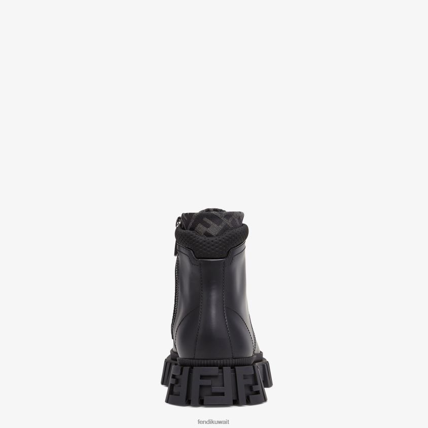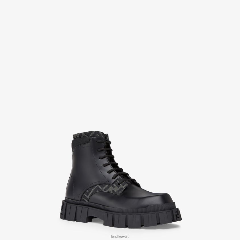 حذاء فندي فورس للكاحل برباط. مصنوع من الجلد باللون الأسود مع تفاصيل من قماش الجاكار باللونين الرمادي والأسود. سحاب من الداخل لجعلها أكثر راحة. نعل مطاطي خفيف مع تفاصيل منقوشة على الكعب.