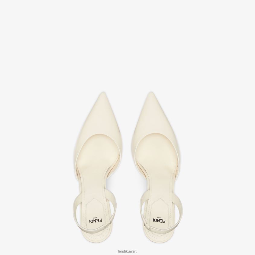 أحذية فندي الأولى ذات مقدمة مدببة وحزام للكاحل. مصنوع من الجلد الأبيض. كعب منحوت على شكل حرف F من المعدن الذهبي اللون.