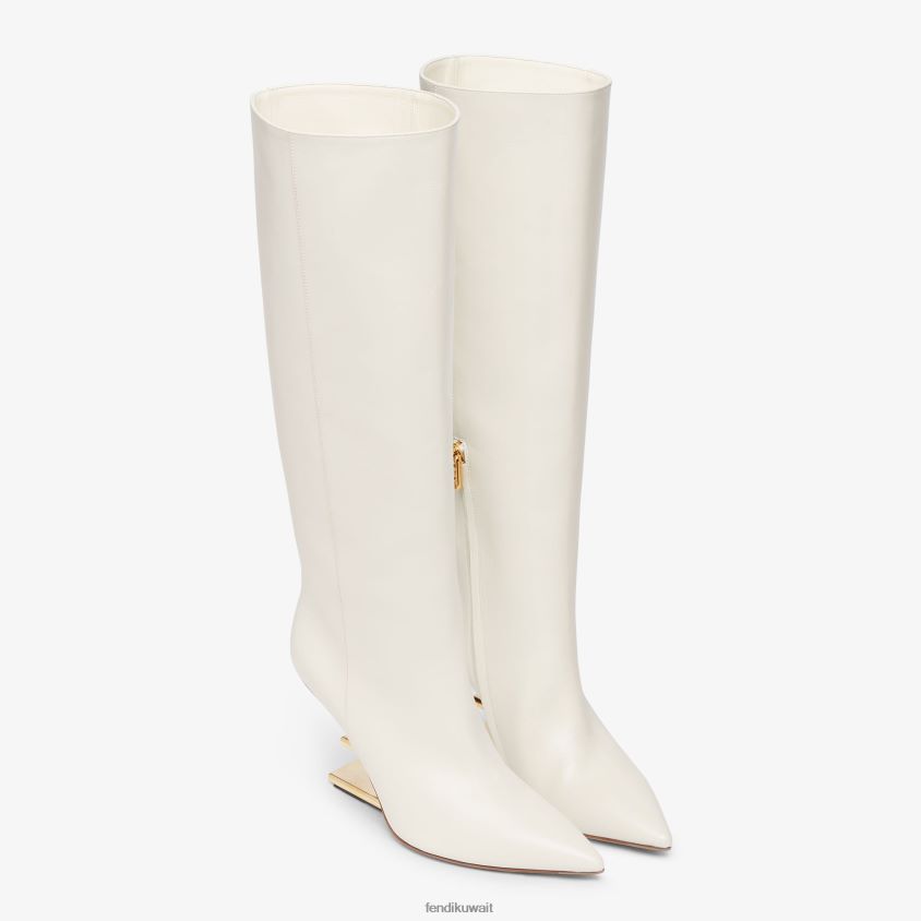 حذاء فندي الأول بمقدمة مدببة وسحاب جانبي من الداخل مع سحاب فندي أولوك. مصنوع من الجلد الأبيض. كعب منحوت على شكل حرف F من المعدن الذهبي اللون.