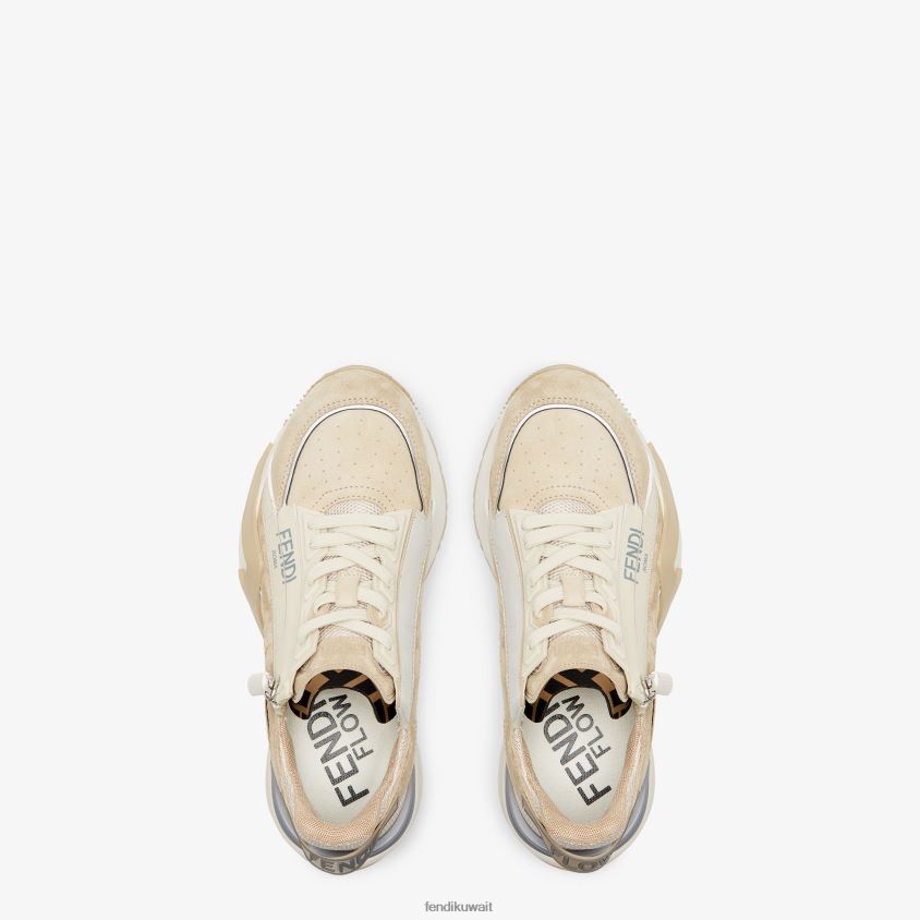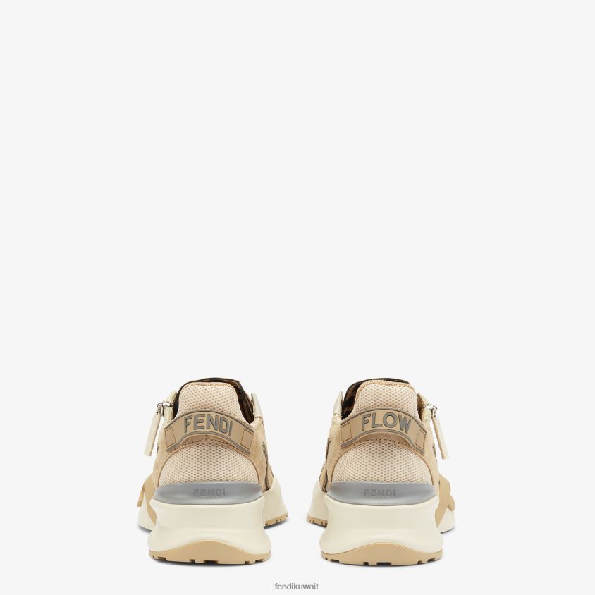 حذاء رياضي سهل الارتداء بأربطة مرنة وسحاب جانبي ونعل مموج مع نقش F. حروف فندي المتدفقة منقوشة على الكعب. مصنوع من جلد الغزال البيج مع حشوات من القماش التكنولوجي. مزين بتفاصيل ليكرا مع شعار ff. نعل مطاطي أبيض خفيف الوزن مع تفاصيل قطرية باللون البيج.