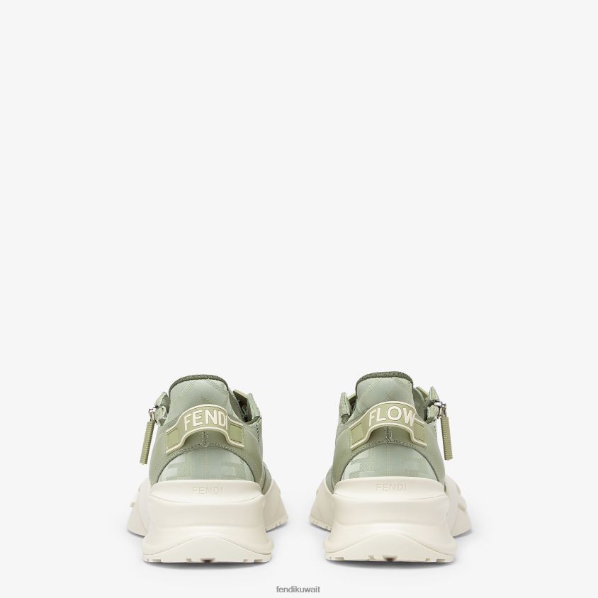 حذاء رياضي فندي فلو مع أربطة مرنة قابلة للتعديل وسحاب جانبي للإغلاق. مخصص بشريط مطاطي يتميز بشعار منقوش على الجزء الخلفي من الكعب. مصنوع من الجلد باللون الأخضر الفاتح. تفاصيل نسيج ff. نعل مطاطي مقاس 35 مم مع تفاصيل قطرية بيضاء.