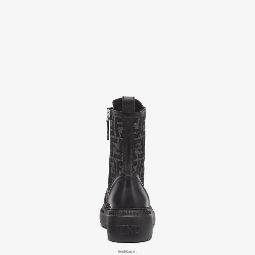 حذاء فندي دومينو القتالي مزود بأربطة وسحاب جانبي من الداخل. مصنوع من الجلد الأسود. مصنوع من القماش بزخارف جاكار ff باللونين الأسود والرمادي. نعل مطاطي مزين بنقش ff على مقدمة القدم.