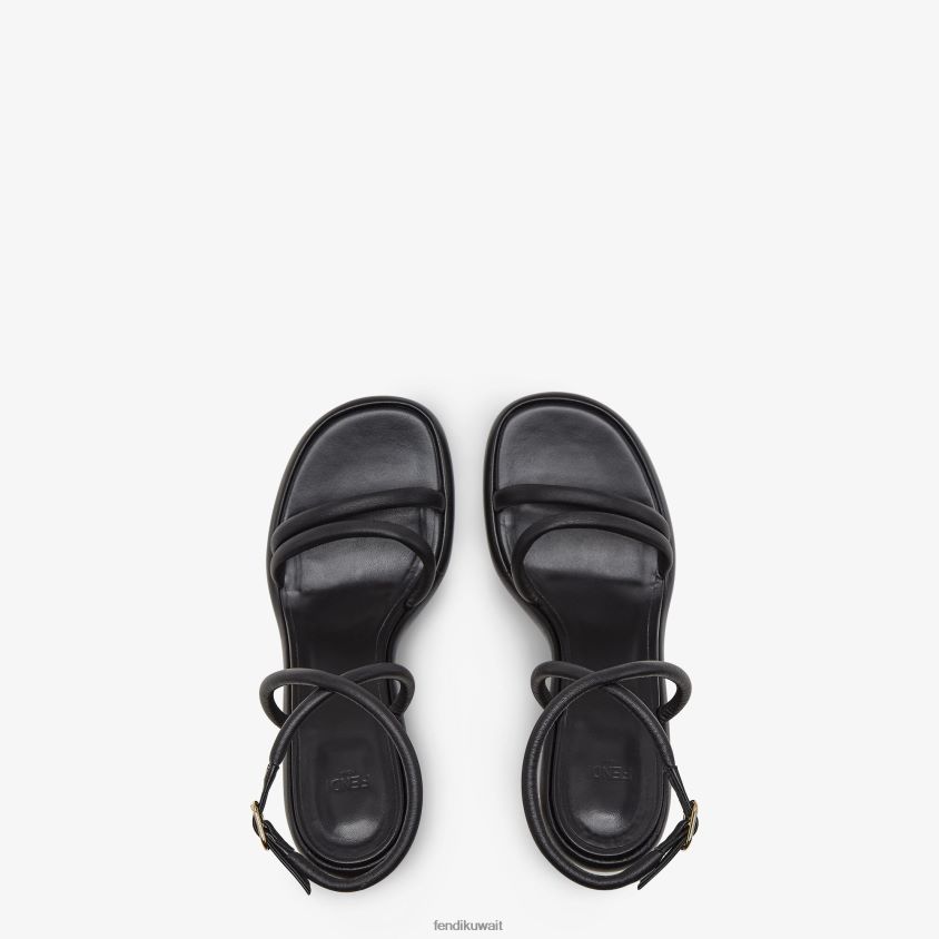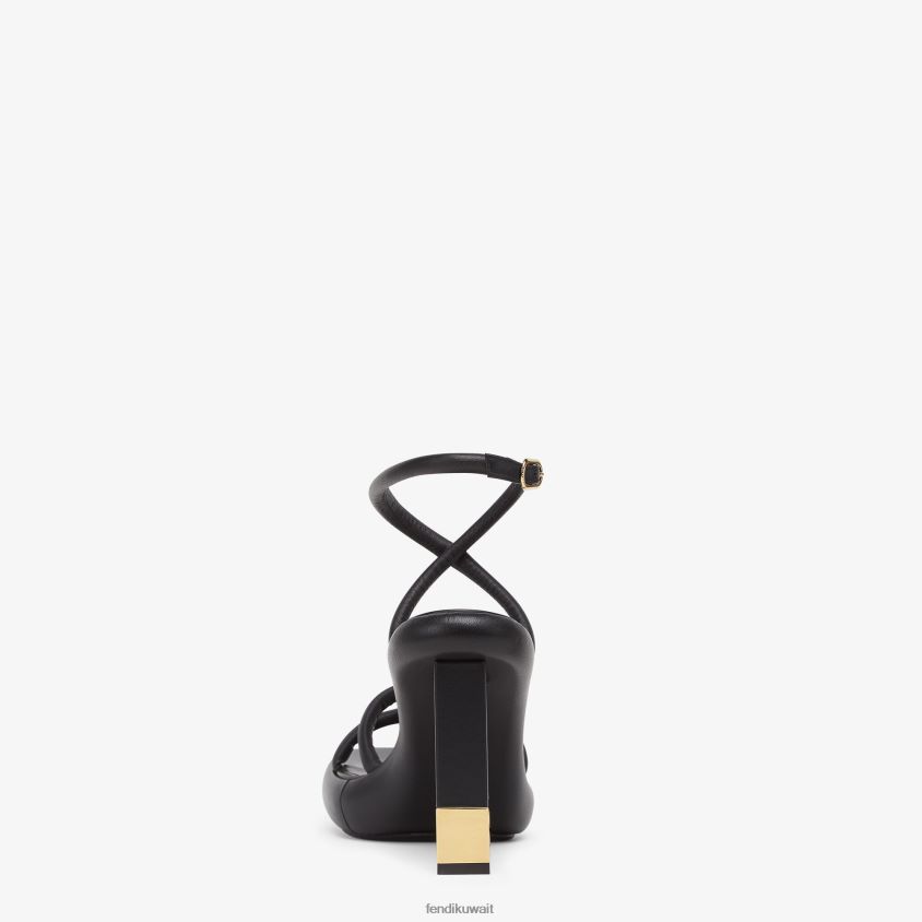 صندل باغيت مع أشرطة مبطنة قليلاً وحزام متقاطع على الكاحل والقوس. مصنوع من جلد نابا باللون الأسود. كعب مع تصميم باغيت ff من المعدن الذهبي.