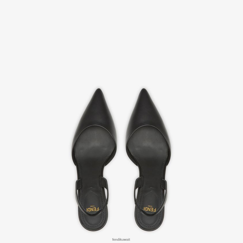 أحذية فندي الأولى ذات مقدمة مدببة وحزام للكاحل. مصنوع من الجلد الأسود. كعب منحوت على شكل حرف F من المعدن الذهبي اللون.