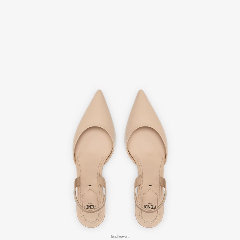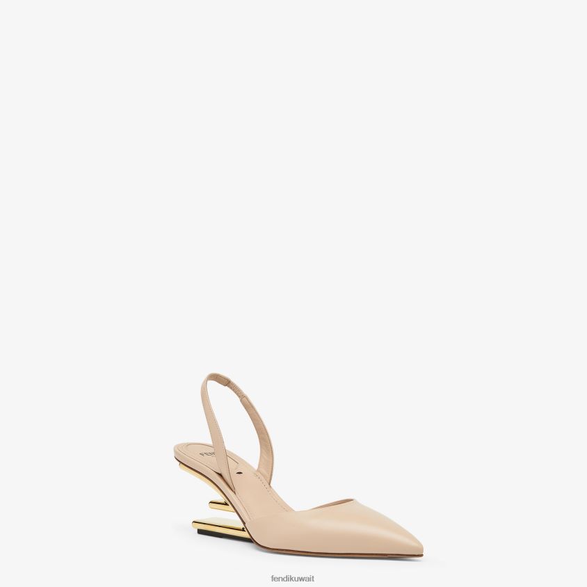 أحذية فندي الأولى ذات مقدمة مدببة وحزام للكاحل. مصنوع من الجلد البيج العاري. كعب منحوت على شكل حرف F من المعدن الذهبي اللون.