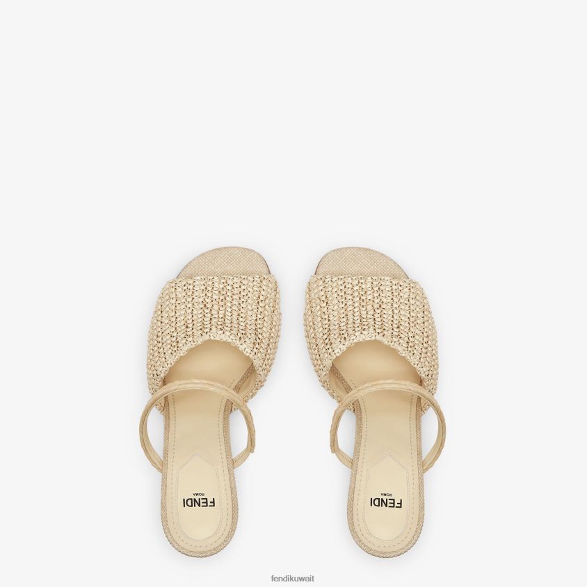 صندل فندي الأول ذو شريط وحزام عريض. مصنوعة من الرافية المضفرة الصفراء الشاحبة. كعب منحوت على شكل حرف F من المعدن الذهبي اللون.