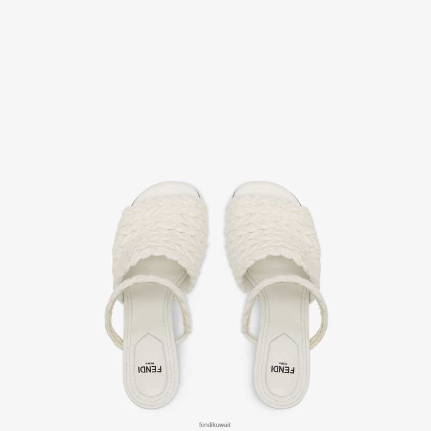 صندل فندي الأول ذو شريط وحزام عريض. مصنوعة من قماش مضفر باللون البيج. كعب منحوت على شكل حرف F من المعدن الذهبي اللون.