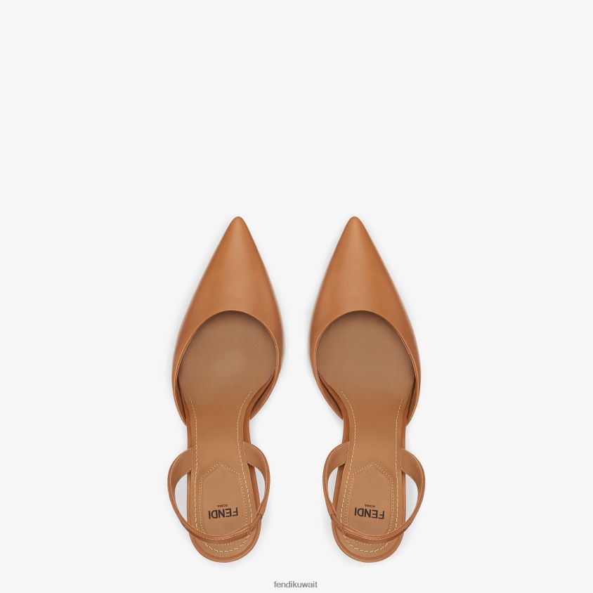 أحذية فندي الأولى ذات مقدمة مدببة وحزام للكاحل. مصنوع من الجلد البني. كعب منحوت على شكل حرف F من المعدن الذهبي اللون.