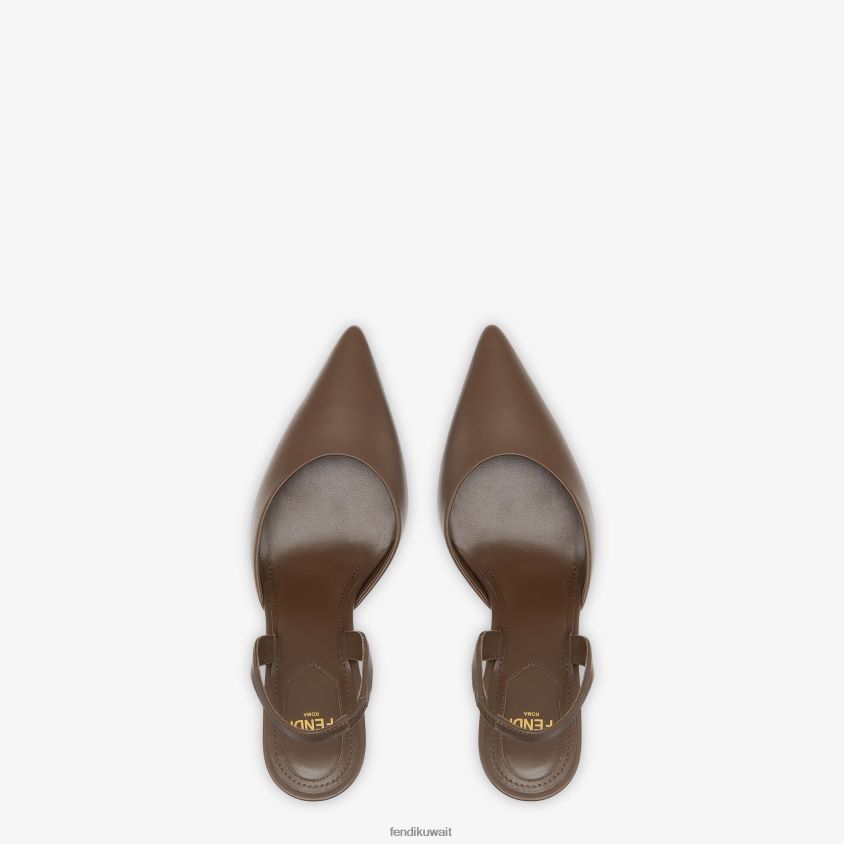 أحذية فندي الأولى ذات مقدمة مدببة وحزام للكاحل. مصنوعة من الجلد البني. كعب منحوت على شكل حرف F من المعدن الذهبي اللون.