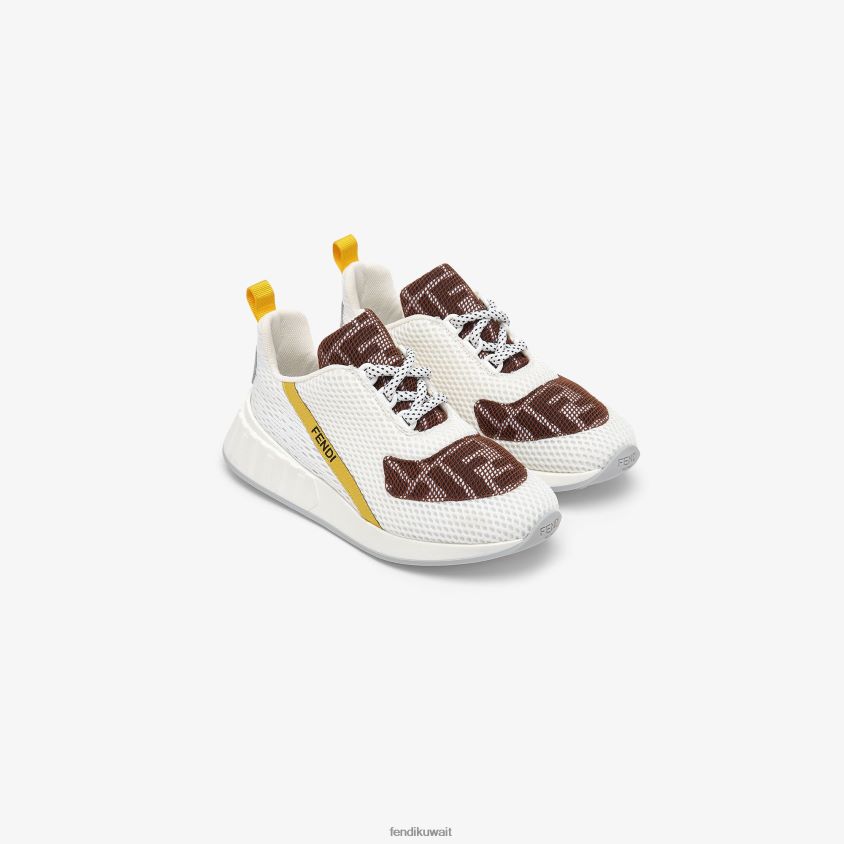 مادة تقنية بيضاء وحذاء رياضي شبكي للصغار مع تفاصيل فندي صفراء. نعل حذاء الجري وشعار العلامة التجارية التبغ ff على الجهة الأمامية.