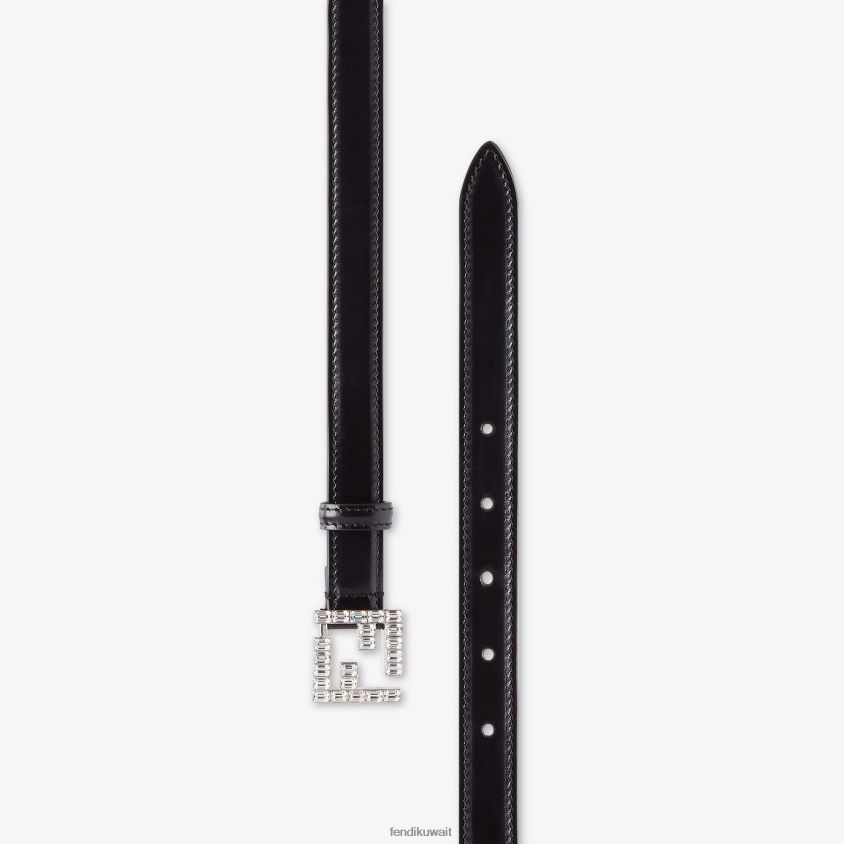 حزام رفيع مزود بحلقة وإبزيم مسمار ff مميز. مصنوع من الجلد الأسود. إبزيم مزين بالكريستال. أدوات معدنية مطلية بالبلاديوم.