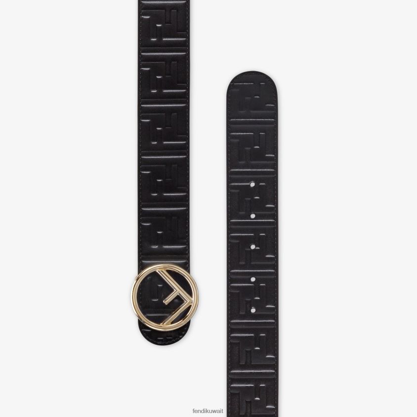حزام عريض بإبزيم على شكل شعار فندي الجديد. إبزيم تثبيت. مصنوع من جلد العجل الأسود. نمط ff في طباعة مرتفعة. أدوات معدنية مطلية بالذهب.