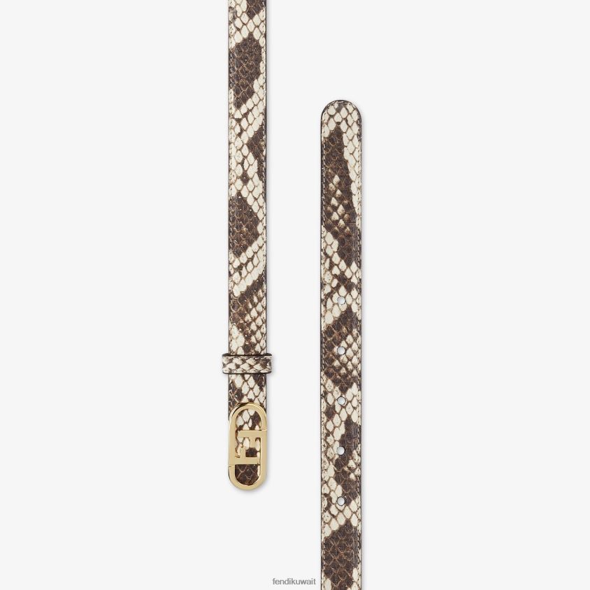 حزام ضيق مع حلقة وإبزيم فندي أولوك. مصنوع من جلد إيلاف بطبعة جلد الثعبان البني. أدوات معدنية مطلية بالذهب.