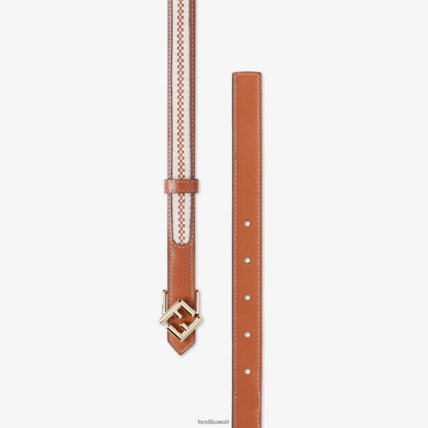 حزام رفيع مزود بحلقة وإبزيم قطري على شكل حرف FF. مصنوع من الجلد البني على أحد الجانبين والكانفاس باللون البيج مع تطريز جرافيك باللون البني على الجانب الآخر. أدوات معدنية مطلية بالذهب.