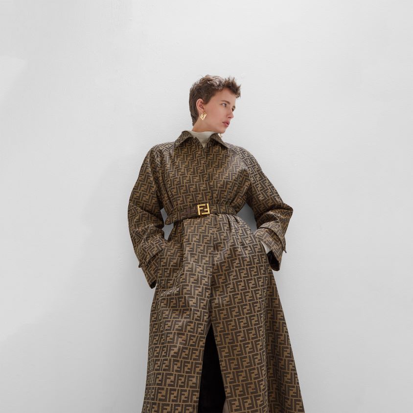 حزام مع حلقة حارس وإبزيم مسمار ff الشهير. مصنوعة من القماش مع شعار ff بظلال من اللون البني. تفاصيل جلدية متناغمة. إكسسوارات معدنية بلمسة نهائية ذهبية عتيقة.