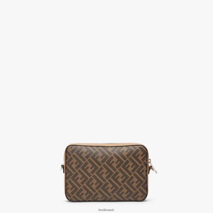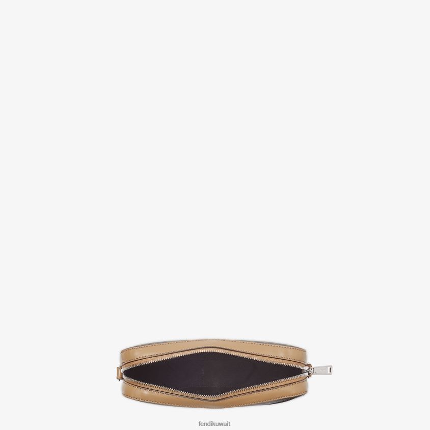 حقيبة كتف مدمجة مصنوعة من الجلد والقماش باللون البيج مع شعار FF. مزين بحشوة مائلة من الجلد باللون البني الداكن.