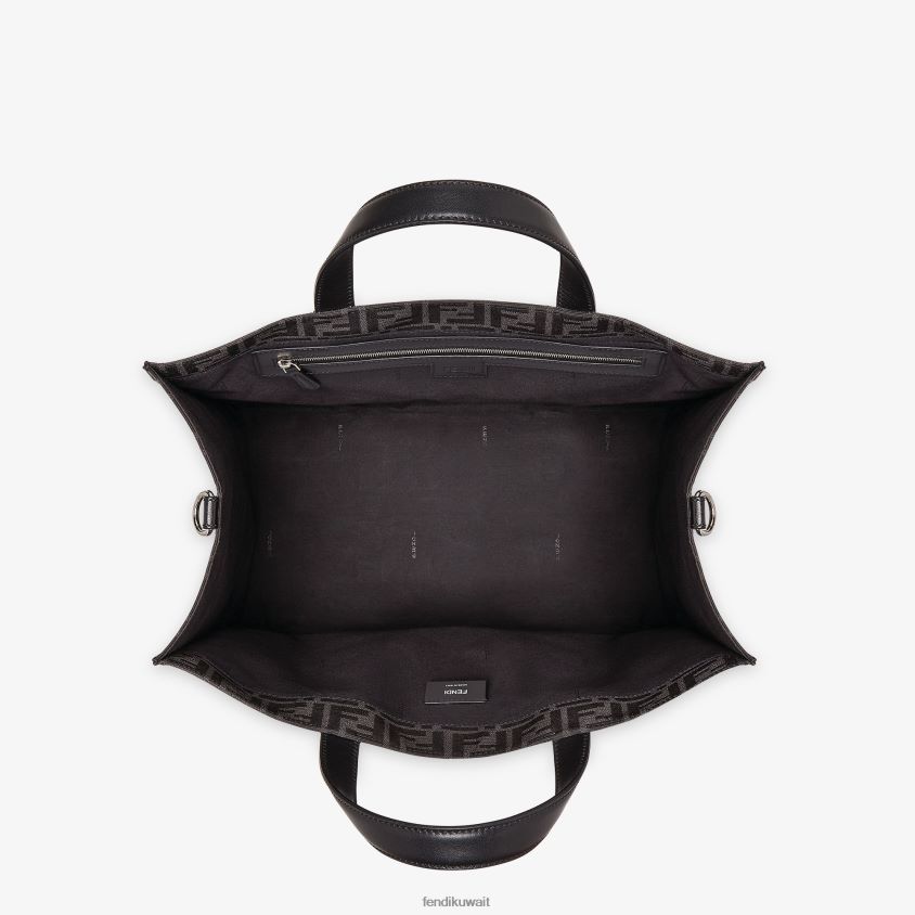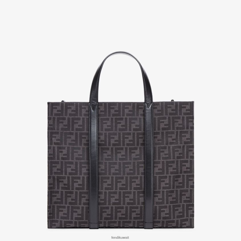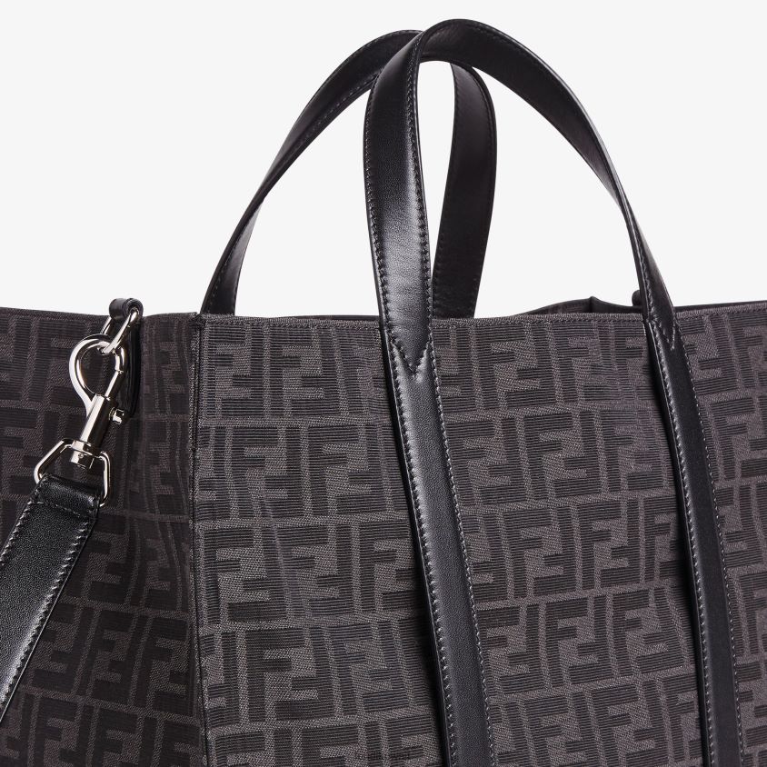 حقيبة تسوق واسعة مصنوعة من قماش الجاكار المُعاد تدويره مع شعار ff باللونين الرمادي والأسود.