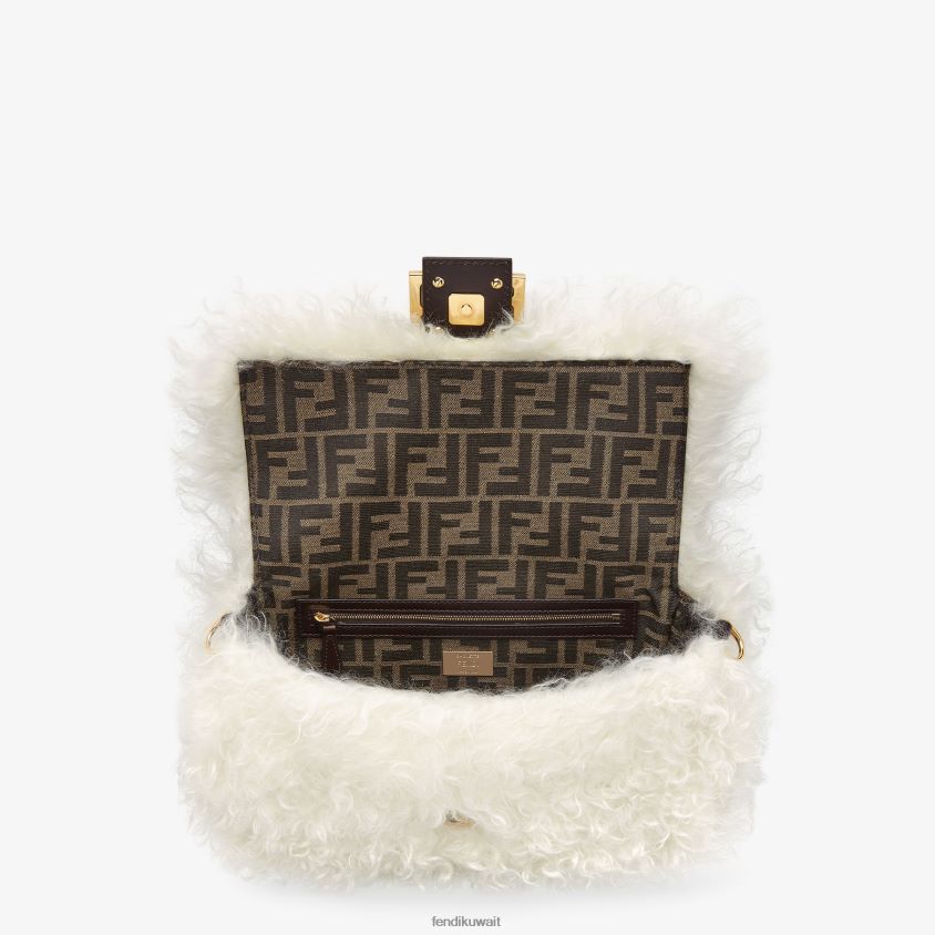 حقيبة باغيت متوسطة الحجم أيقونية مصنوعة من صوف الموهير بملمس الفرو ومزينة بجلد بني داكن. مزينة بمشبك ff.