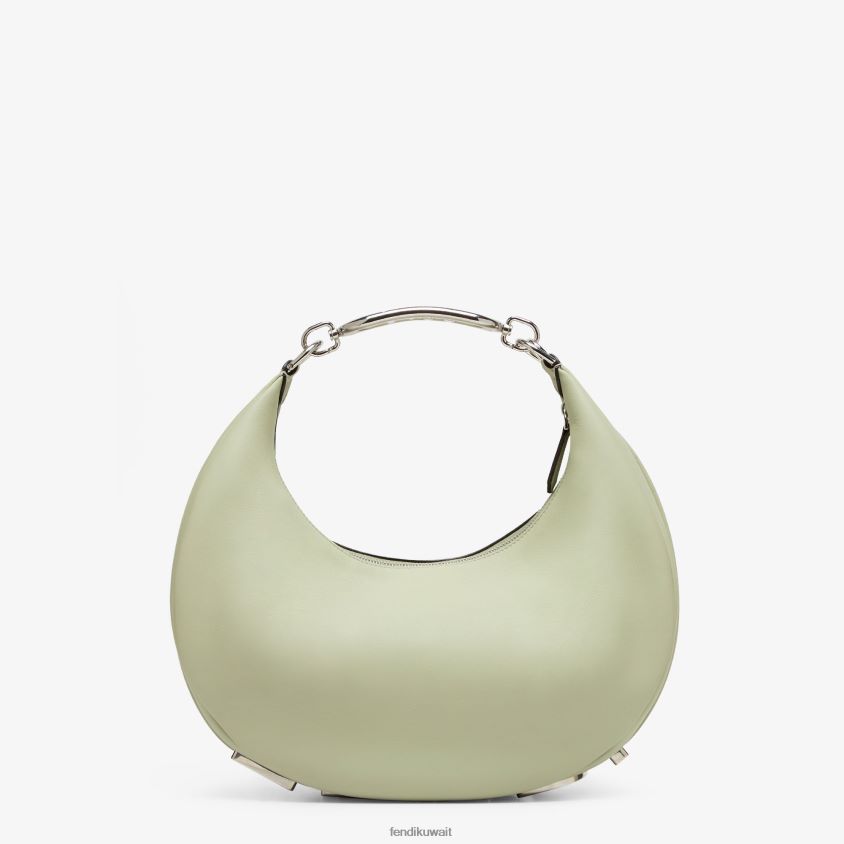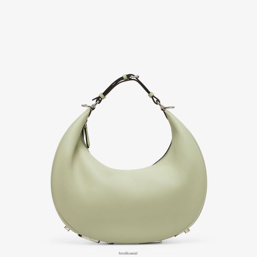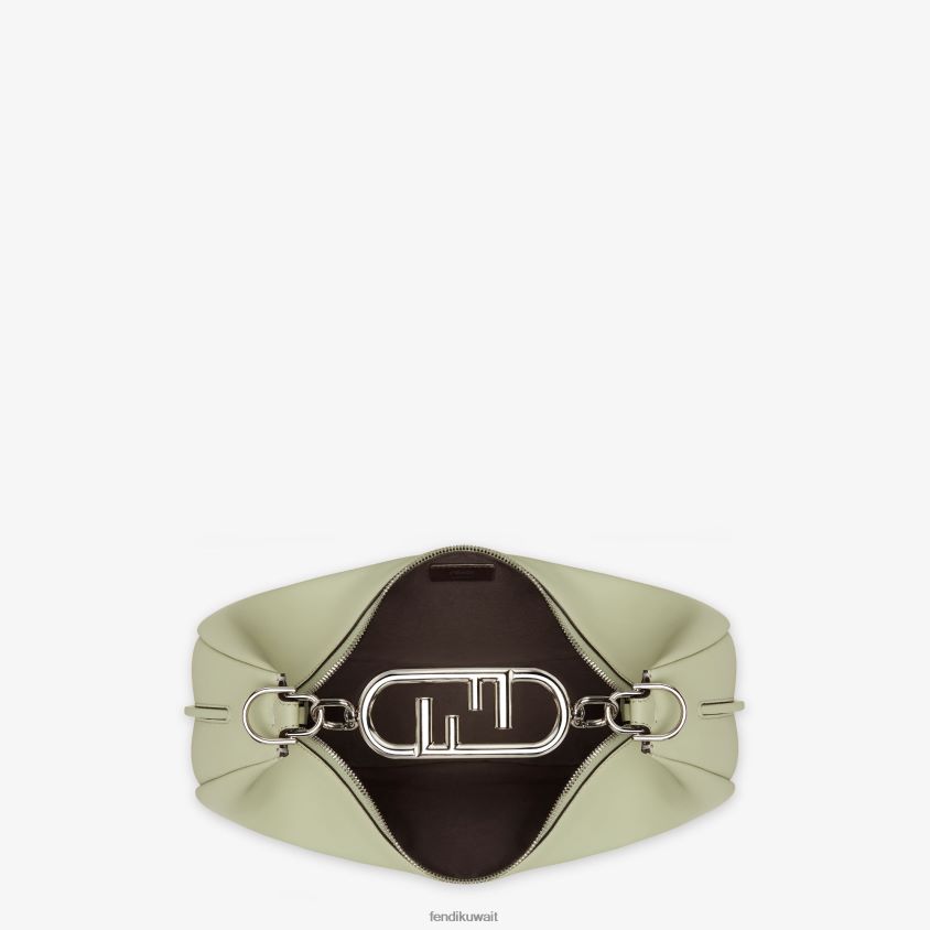 حقيبة هوبو متوسطة الحجم مصنوعة من الجلد باللون الأخضر الفاتح، ومزينة بحروف فندي من معدن البلاديوم العتيق، يمكن رؤيتها عند ارتداء الحقيبة تحت الذراع.