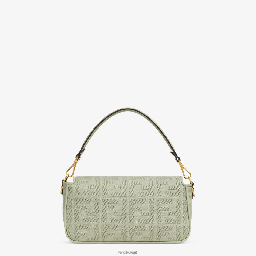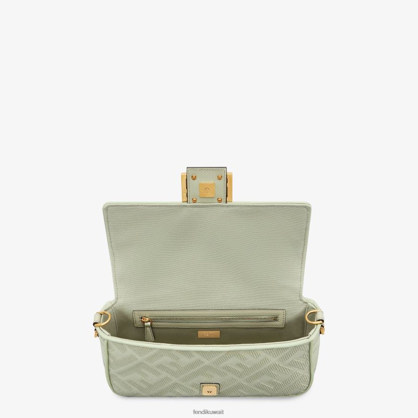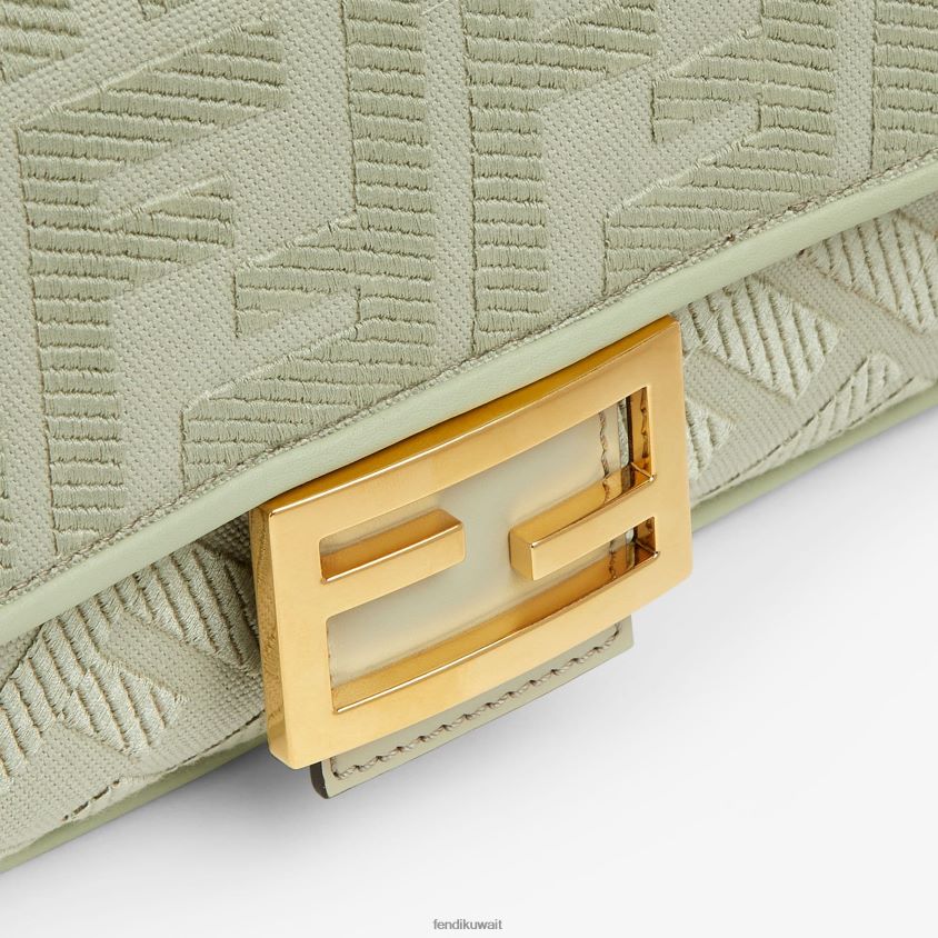 حقيبة باغيت متوسطة الحجم أيقونية مصنوعة من القماش باللون الأخضر الفاتح مع شعار ff بارز مع تطريز ملون، ومزخرفة بالجلد ومزينة بمشبك ff.