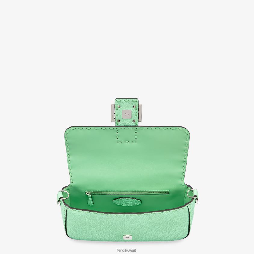حقيبة باغيت متوسطة الحجم أيقونية مصنوعة من جلد كويو رومانو باللون الأخضر ومزينة يدويًا بخياطة متطابقة. مزين بمشبك ff. تتميز بغطاء أمامي، ومشبك مغناطيسي، وحجرة داخلية بجيب بسحاب، وختم سيليريا من الجلد، وأدوات معدنية مطلية بالبلاديوم.