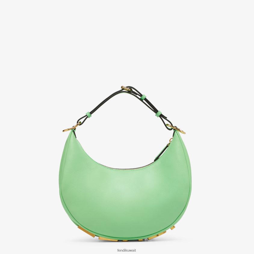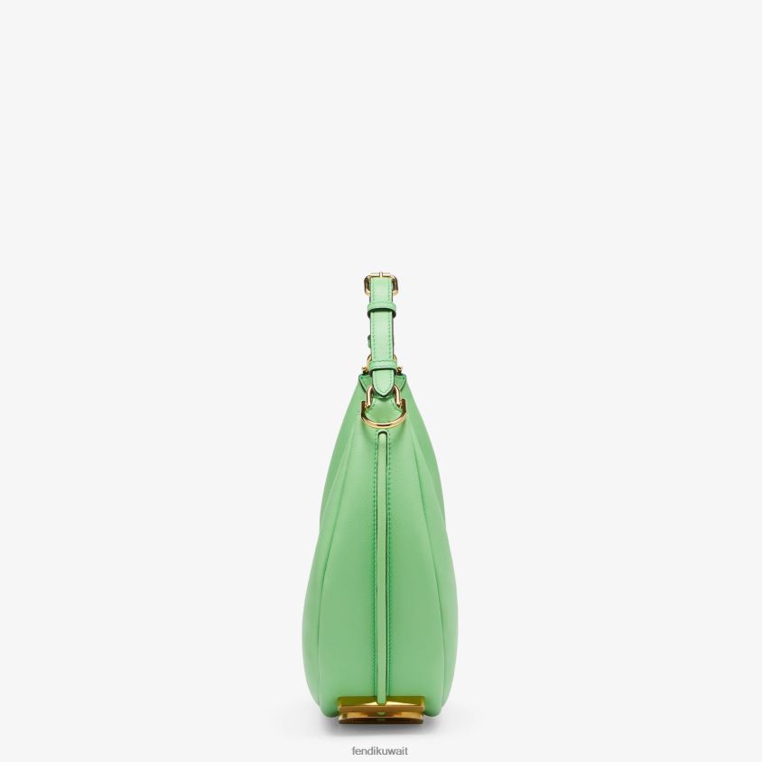حقيبة هوبو صغيرة مصنوعة من الجلد الأخضر المرن، ومزينة بحروف فندي معدنية ذهبية عتيقة يمكن رؤيتها عند ارتداء الحقيبة تحت الذراع.