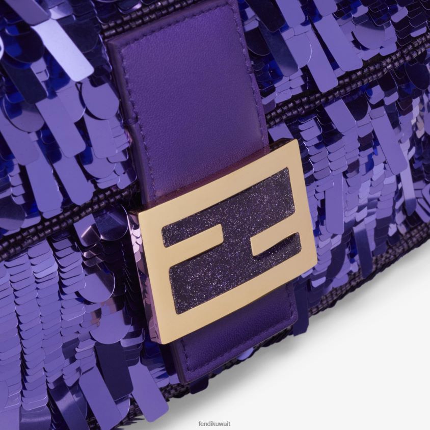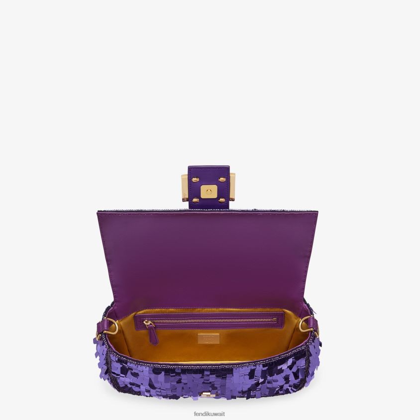 حقيبة باغيت متوسطة الحجم ومطرزة بشكل ناعم على كامل تصميمها بالترتر الأرجواني بأشكال وأحجام مختلفة لإضفاء تأثير ثلاثي الأبعاد ومزينة بمشبك على شكل حرف FF. هذا النمط هو إعادة إصدار للنسخة الأصلية التي تم تقديمها لأول مرة في مجموعة خريف/شتاء 1999-2000. يتميز بغطاء أمامي وتفاصيل جلدية متناغمة ومشبك مغناطيسي. حجرة داخلية مع جيب بسحاب وأدوات معدنية مطلية بالذهب. يمكن حمل الحقيبة باليد، أو ارتداؤها إما على الكتف أو حول الجسم بفضل المقبض الجلدي وحزام الكتف، وكلاهما قابل للفصل.