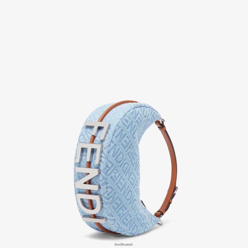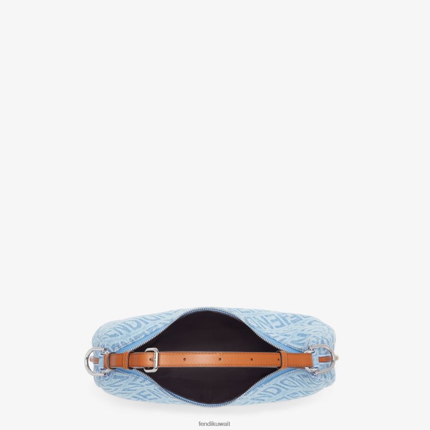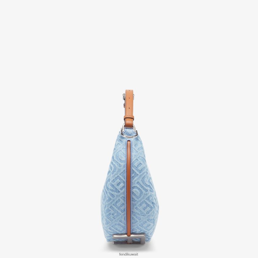 حقيبة هوبو صغيرة مصنوعة من قماش الدنيم باللون الأزرق الفاتح مع مرآة فندي على كامل التصميم وتفاصيل من الجلد باللون البني. مزينة بحروف فندي من معدن البلاديوم العتيق، ويمكن رؤيتها عند ارتداء الحقيبة تحت الذراع.