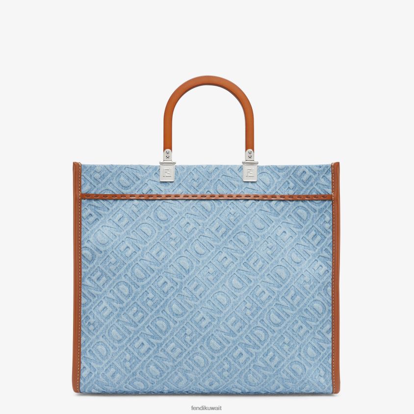 حقيبة تسوق Sunshine متوسطة الحجم مصنوعة من قماش الدنيم باللون الأزرق الفاتح ومزينة بزخارف مرآة فندي بالكامل. يتميز بحروف فندي روما بمقابض جلدية بنية وقوية.