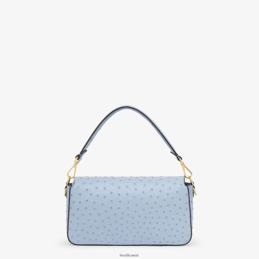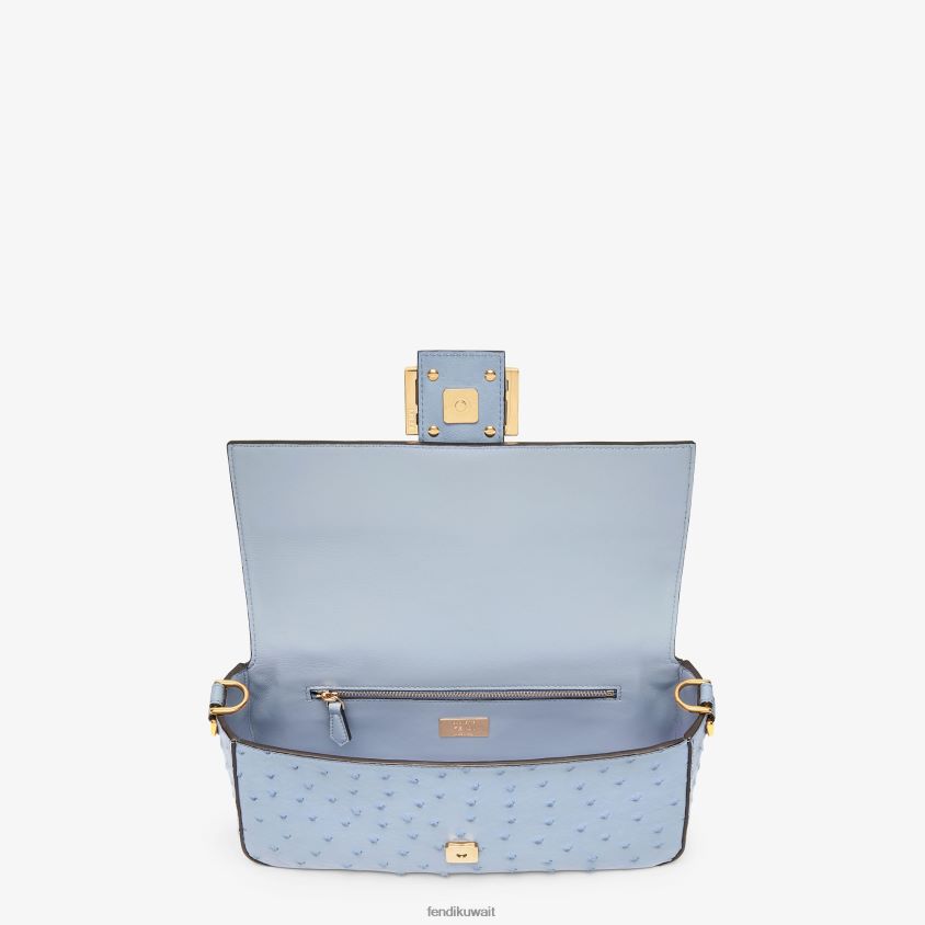 حقيبة باغيت متوسطة الحجم مصنوعة من جلد النعام باللون الأزرق الفاتح الرائع ومزينة بمشبك ff.