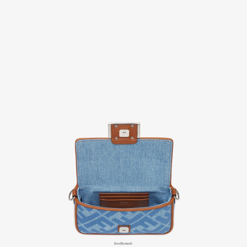 حقيبة باغيت صغيرة أيقونية مصنوعة من قماش الدنيم باللون الأزرق الفاتح مع شعار ff بدرجة لونية وتطريز بارز. بلمسة نهائية من الجلد باللون البني ومزينة بمشبك على شكل حرف ff.