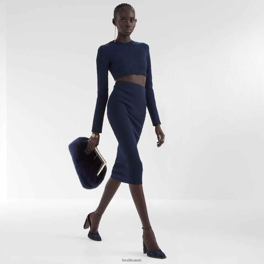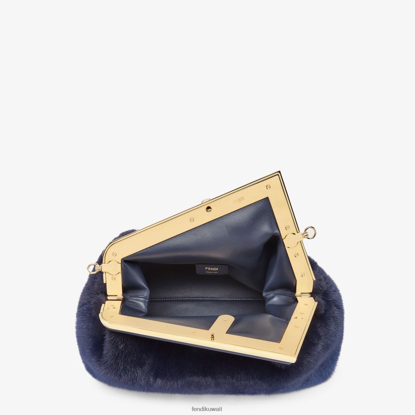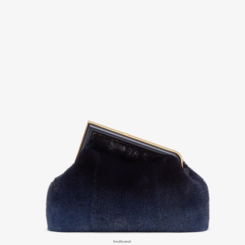 حقيبة فندي الأولى متوسطة الحجم مصنوعة من فرو المنك الناعم ذو التأثير المتدرج باللون الأزرق الداكن مع مشبك معدني كبير الحجم مثبت على شكل حرف F على جلد نابا.