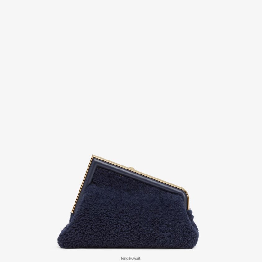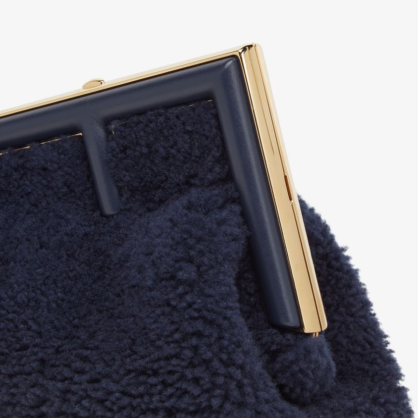 حقيبة فندي الأولى صغيرة مصنوعة من جلد الغنم الناعم باللون الأزرق الداكن مع مشبك معدني كبير الحجم مثبت على جلد نابا.