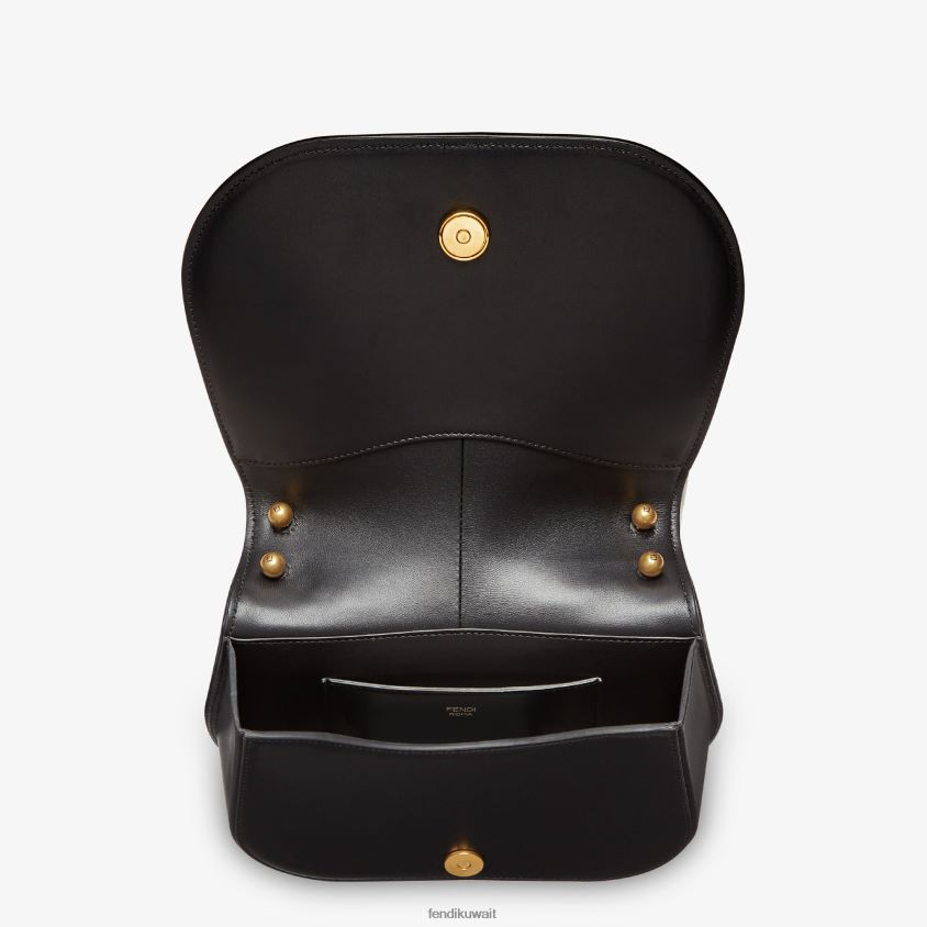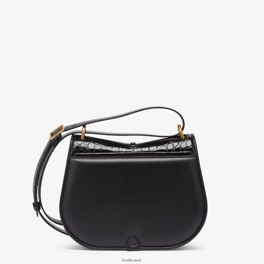 حقيبة متوسطة الحجم بخطوط أنثوية منحنية باللون الأسود، مع غطاء رائع وطويل من جلد التمساح مزين بشعار ff المعدني. جسم الحقيبة وجوانبها مصنوعان من الجلد الناعم المتناغم.