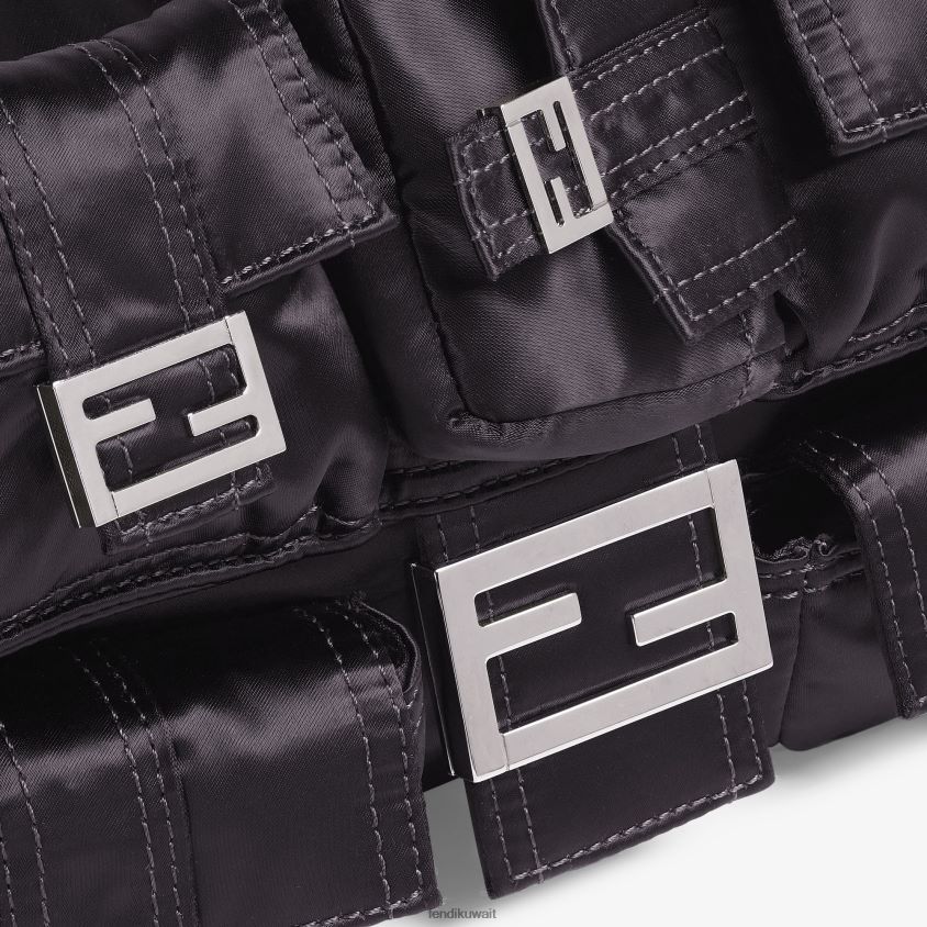 حقيبة باغيت متعددة الجيوب مصنوعة من النايلون الأسود اللامع المُعاد تدويره، مع خمسة جيوب بأحجام مختلفة. تم تزيين الجيوب والغطاء الأمامي بمشبك ff الشهير. مزينة بجلد أسود.