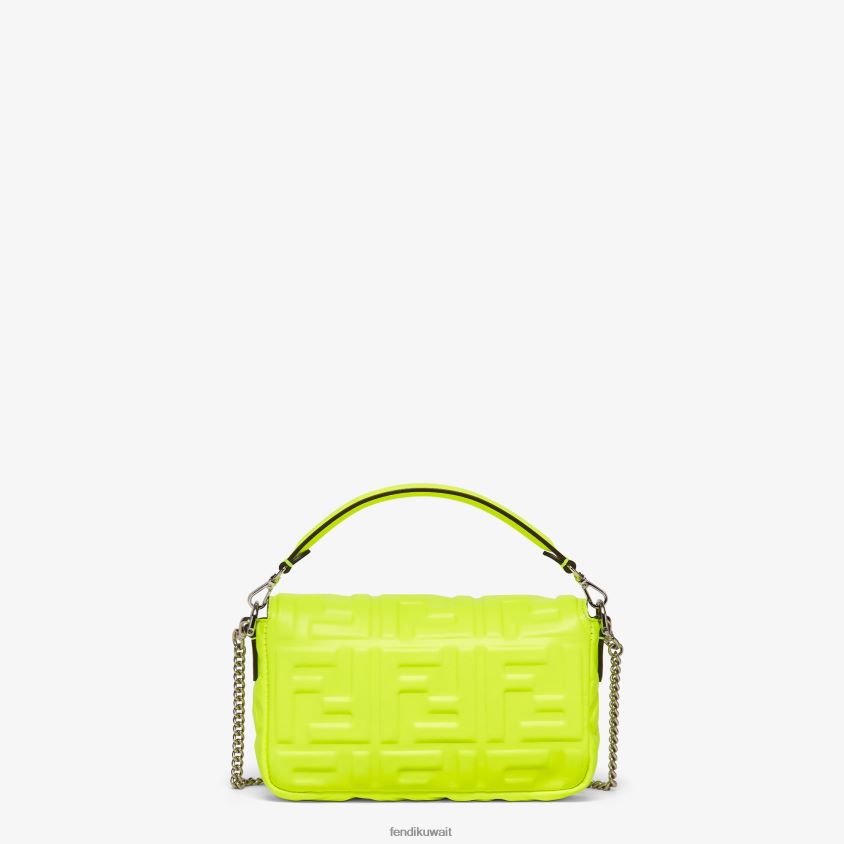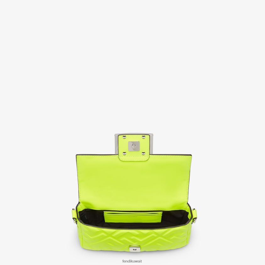 حقيبة باغيت صغيرة أيقونية مصنوعة من جلد نابا الناعم باللون الأصفر النيون مع شعار ff منقوش ثلاثي الأبعاد. مزينة بمشبك على شكل حرف FF.