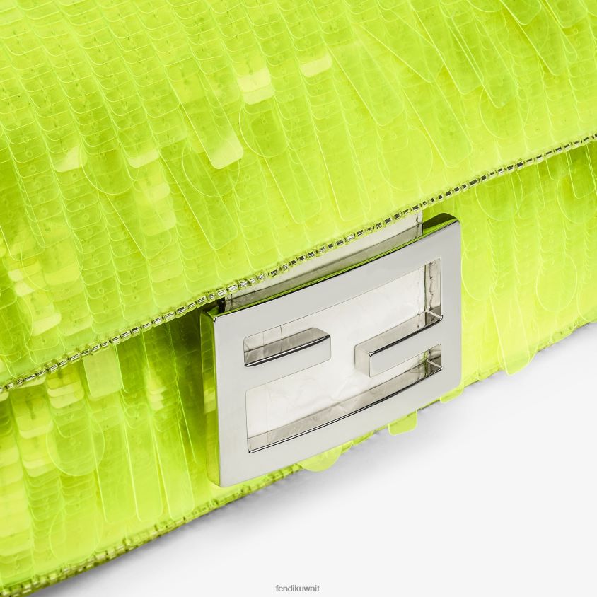 حقيبة باغيت صغيرة أيقونية مطرزة بالكامل بالترتر الأصفر النيون الشفاف بأشكال وأحجام مختلفة. مزين بمشبك ff. تتميز بغطاء أمامي، وتفاصيل رائعة من الجلد الأبيض، ومشبك مغناطيسي، وحجرة داخلية واحدة مبطنة بالساتان الأصفر النيون مع جيب وأدوات معدنية مطلية بالبلاديوم.