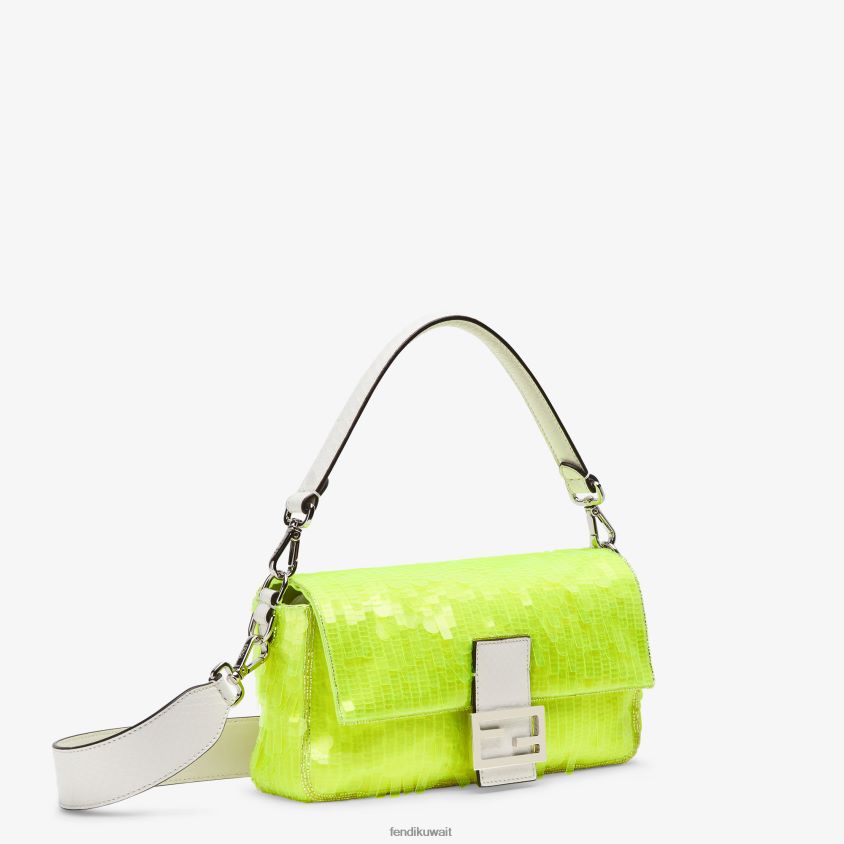 حقيبة باغيت متوسطة الحجم ومطرزة بالكامل بالترتر الأصفر النيون الشفاف بأشكال وأحجام مختلفة. مزين بمشبك ff. تتميز بغطاء أمامي وتفاصيل رائعة من جلد الإفي باللون الأبيض ومشبك مغناطيسي وحجرة داخلية مبطنة بالساتان الأصفر النيون مع جيب بسحاب وأدوات معدنية مطلية بالبلاديوم.