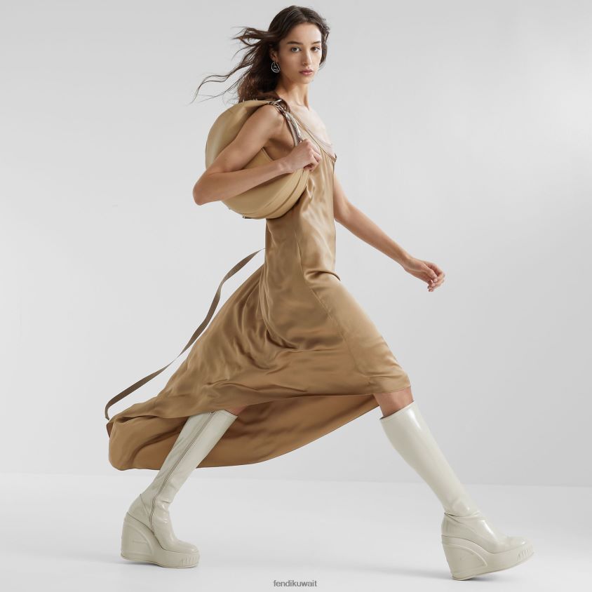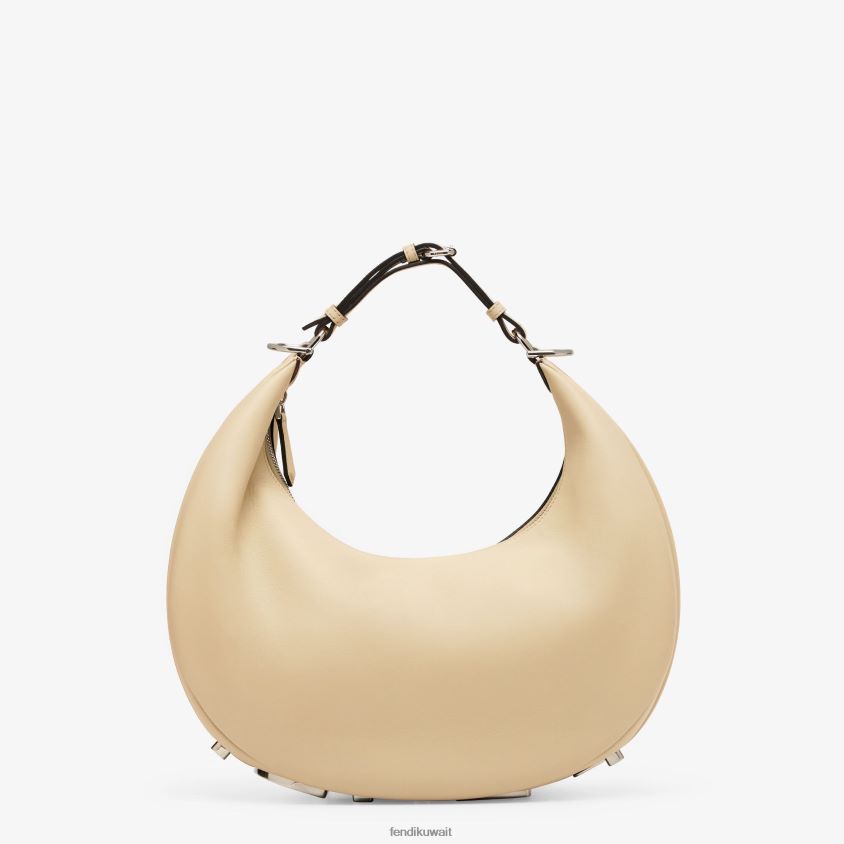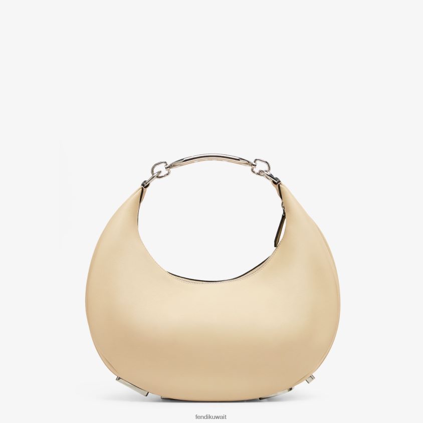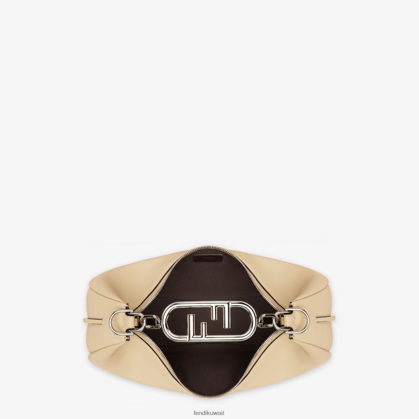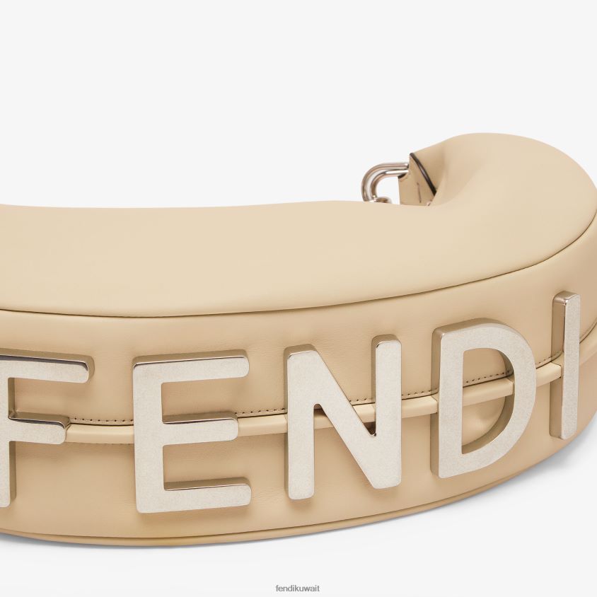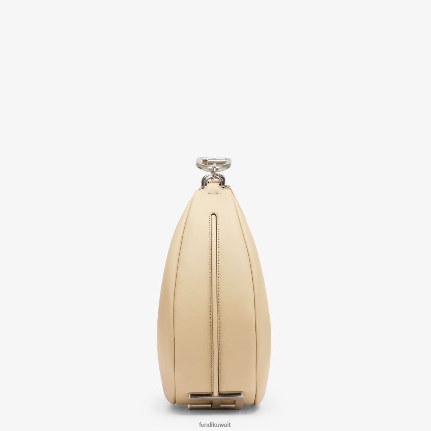 حقيبة هوبو متوسطة الحجم مصنوعة من جلد مرن باللون البيج غير اللامع، ومزينة بحروف فندي من معدن البلاديوم العتيق، يمكن رؤيتها عند ارتداء الحقيبة تحت الذراع.