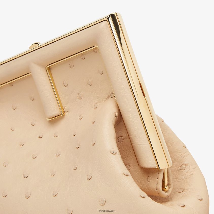 حقيبة فندي الأولى صغيرة مصنوعة من جلد النعام باللون البيج الرائع مع مشبك معدني كبير الحجم مثبت على شكل حرف F على جلد نابا.