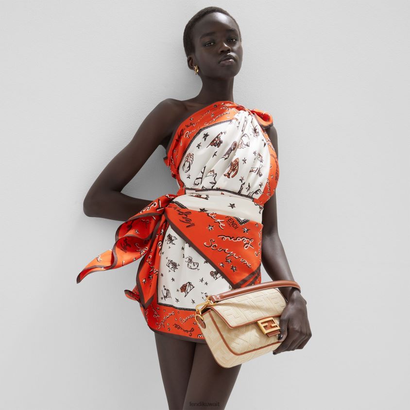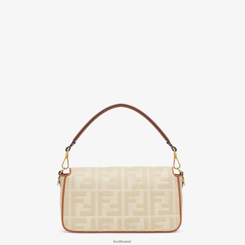 حقيبة باغيت متوسطة الحجم أيقونية مصنوعة من القش ذو اللون الطبيعي مع تطريز بارز على شكل حرف FF. مزينة بحواف من الجلد باللون البني ومشبك على شكل حرف FF.