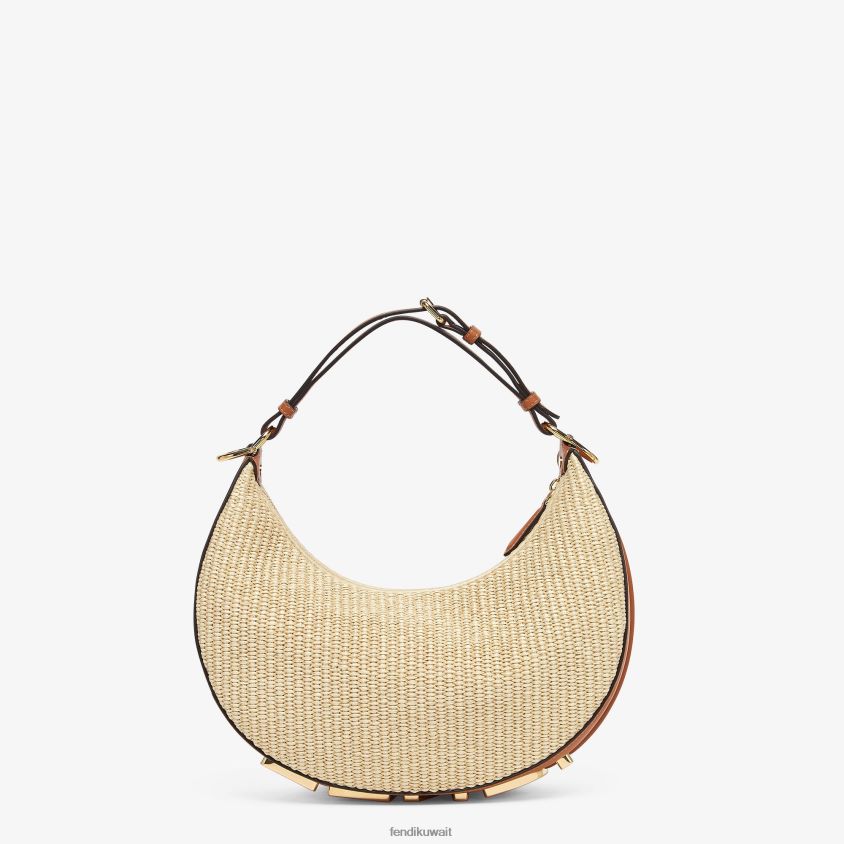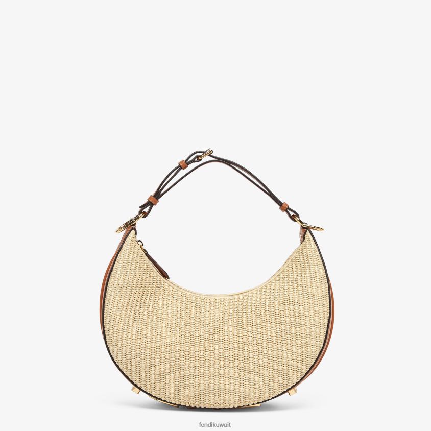 حقيبة هوبو صغيرة مصنوعة من القش ذو اللون الطبيعي في نسيج مزخرف بخياطة الطحلب، مع خلفية وتفاصيل من الجلد البني. مع حروف فندي معدنية ذهبية عتيقة يمكن رؤيتها عند ارتداء الحقيبة تحت الذراع.