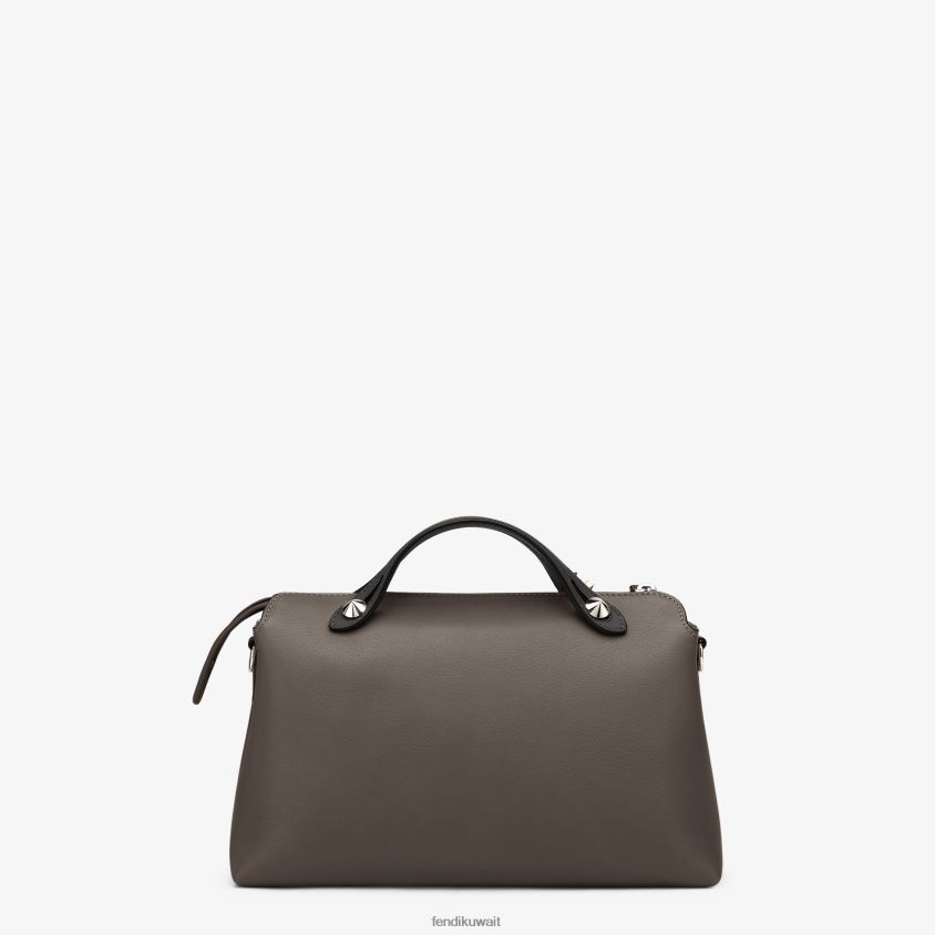 حقيبة باي واي بوسطن المميزة المتوسطة الحجم مصنوعة من الجلد باللون الرمادي الداكن مع سحاب للإغلاق.