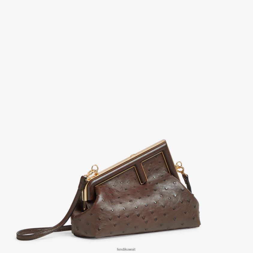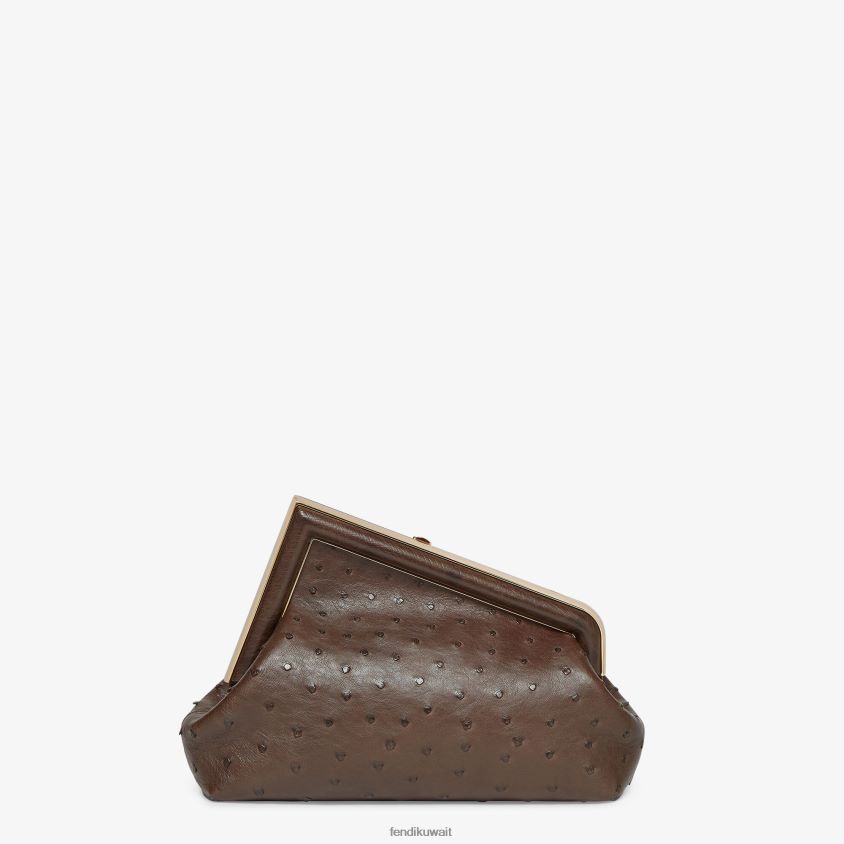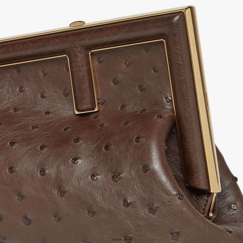 حقيبة فندي الأولى الصغيرة مصنوعة من جلد النعام باللون البني الداكن الرائع مع مشبك معدني كبير الحجم مثبت على جلد نابا.