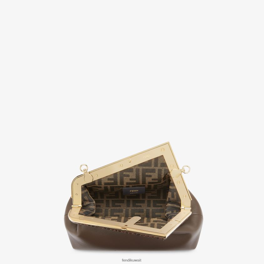 حقيبة فندي الأولى صغيرة مصنوعة من جلد نابا باللون البني الداكن الناعم مع مشبك معدني كبير الحجم على شكل حرف F مربوط بلون رائع على جلد الثعبان.